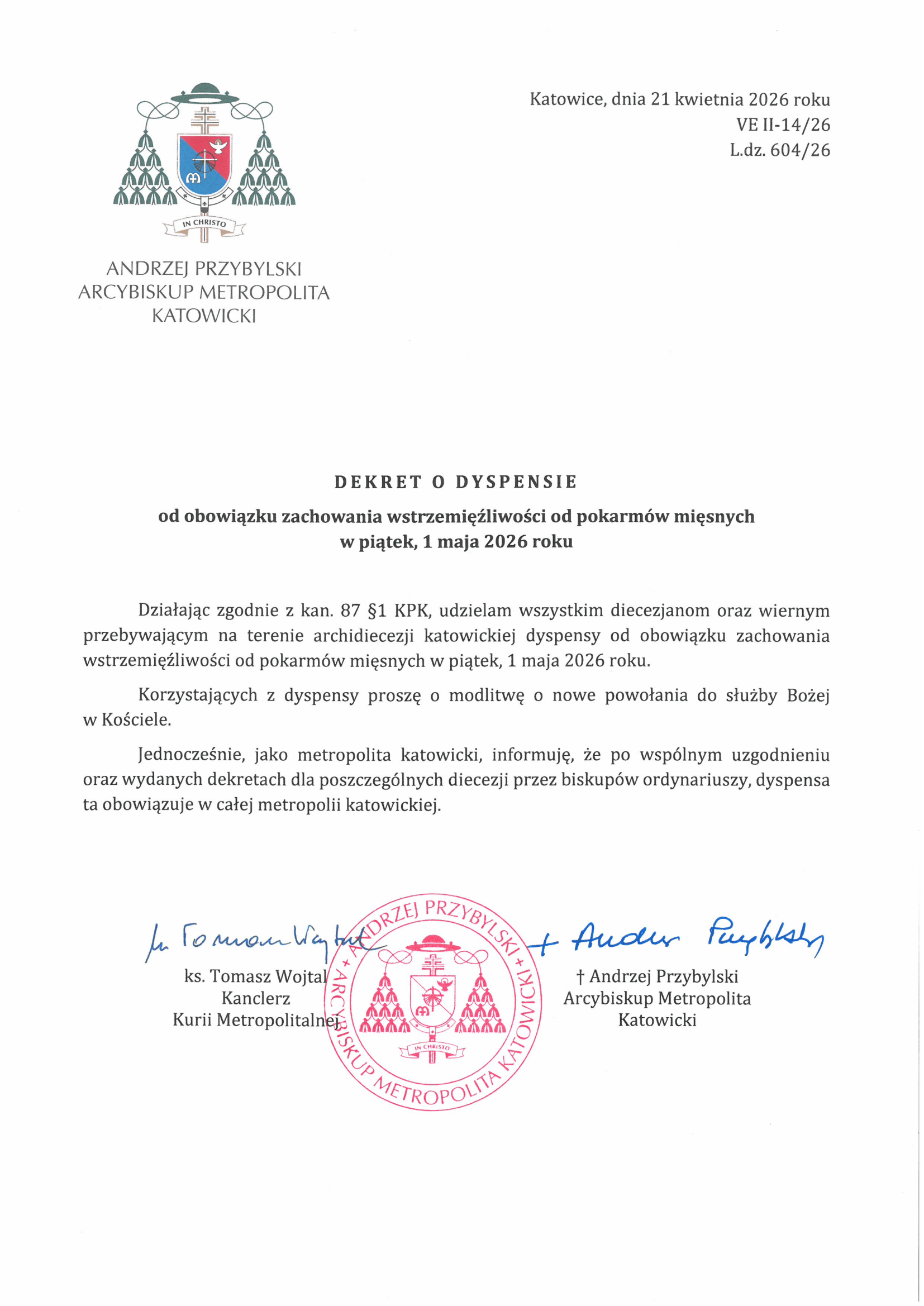 Dekret o dyspensie od obowiązku zachowania wstrzemięźliwości od pokarmów mięsnych w piątek, 1 maja 2026 roku.