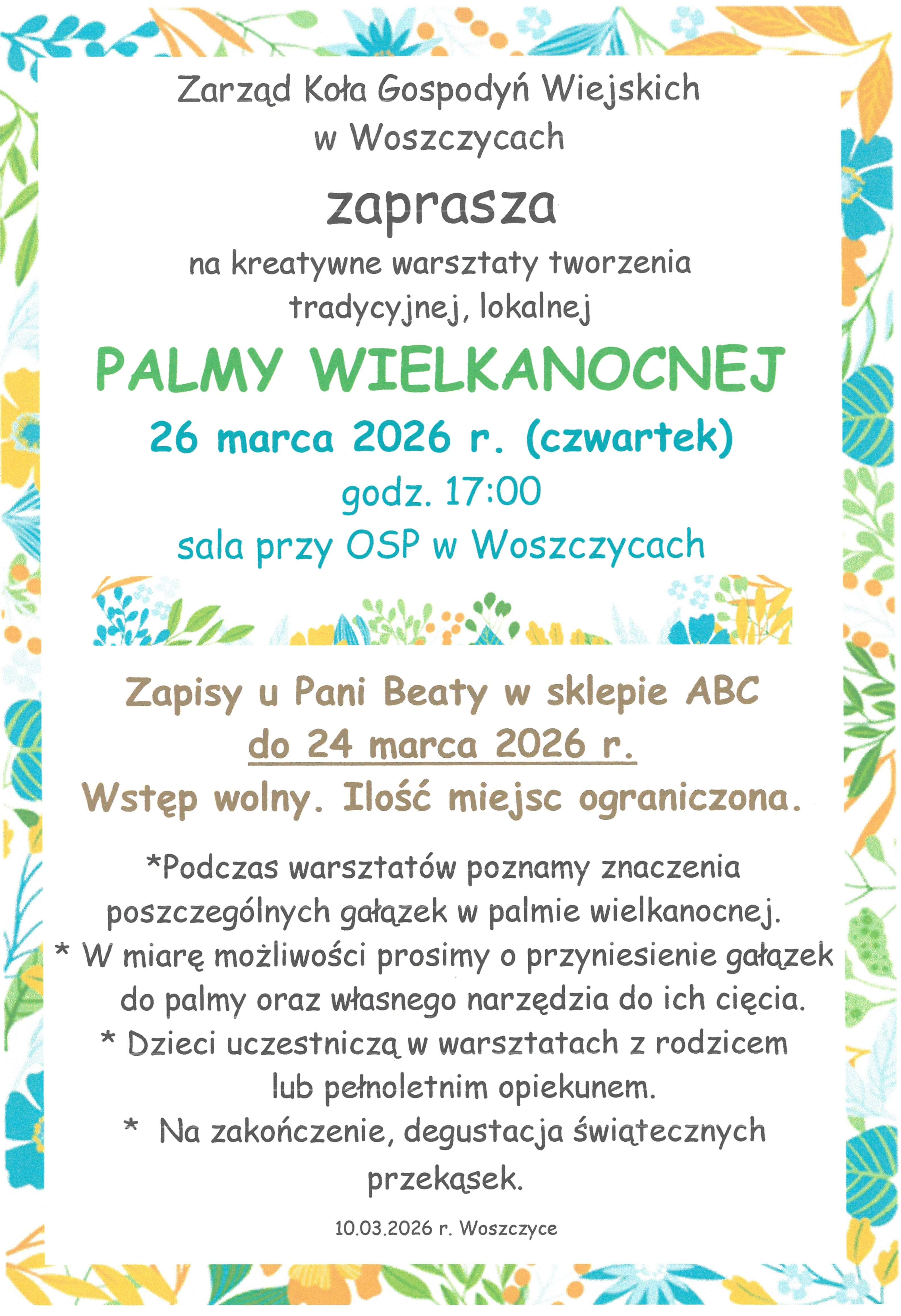 Zarząd KGW w Woszczycach zaprasza na warsztaty tworzenia palmy wielkanocnej w czwartek o 17:00 w Sali przy OSP w Woszczycach. Zapisy u Pani Beaty w sklepie ABC do wtorku. Więcej szczegółów na plakacie.